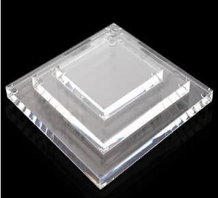9"x 9"x 1/2" Clear Acrylic Base. Acrylic Bases create a great way to display art sculptures, minerals & fossils, merchandise, collectibles, and any other mementos. Bases are highly polished with a crystal clear finish. Various block heights grouped together can be used to create a completely unique look. For a completely custom look or creative ideas and designs contact us!